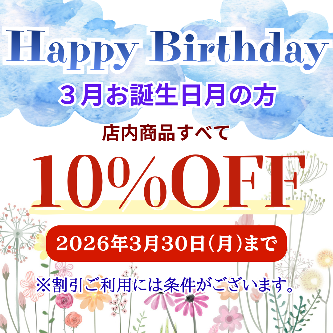 お誕生日月の方限定、店頭商品を10%OFFにてご購入いただけます。